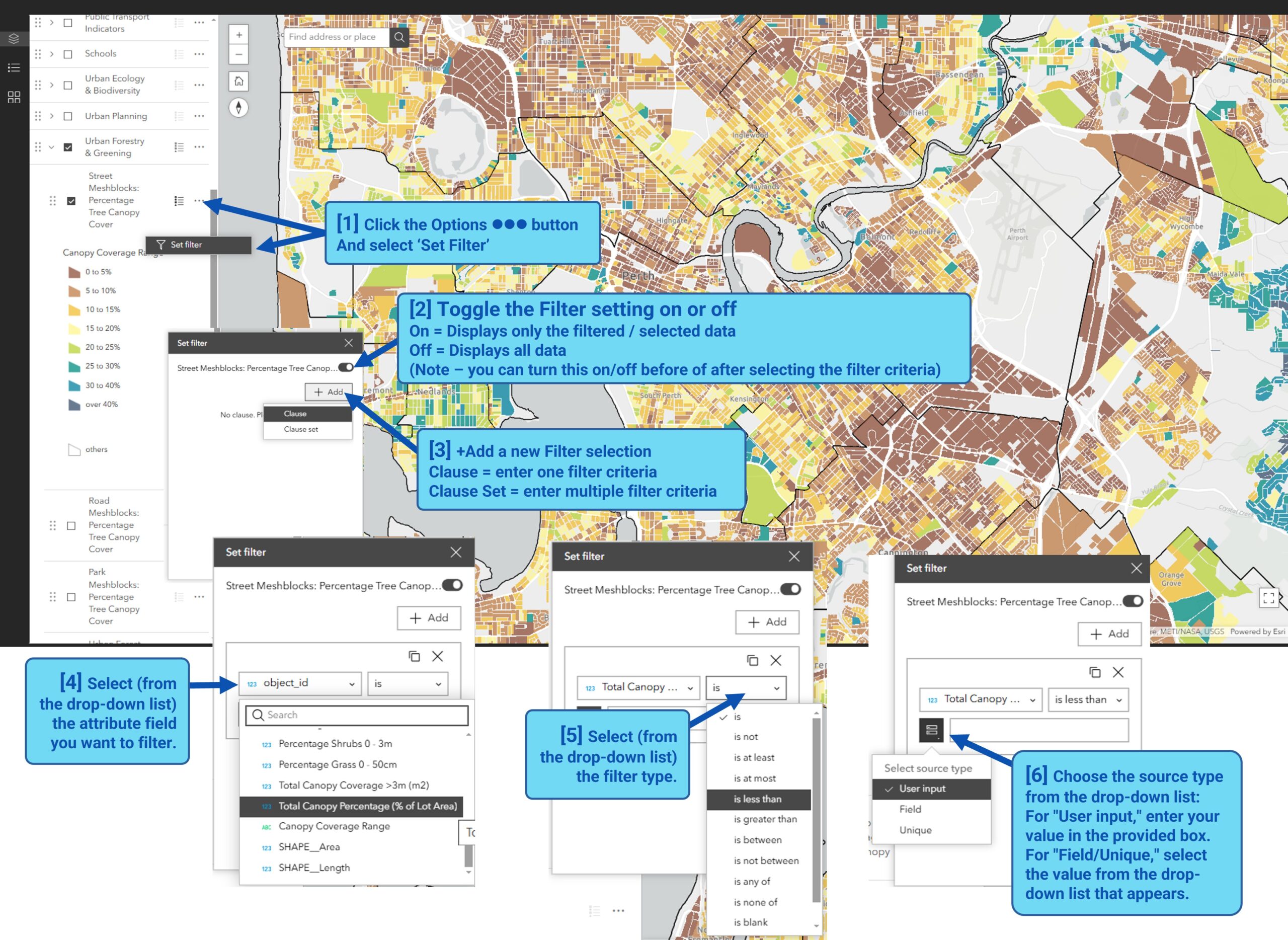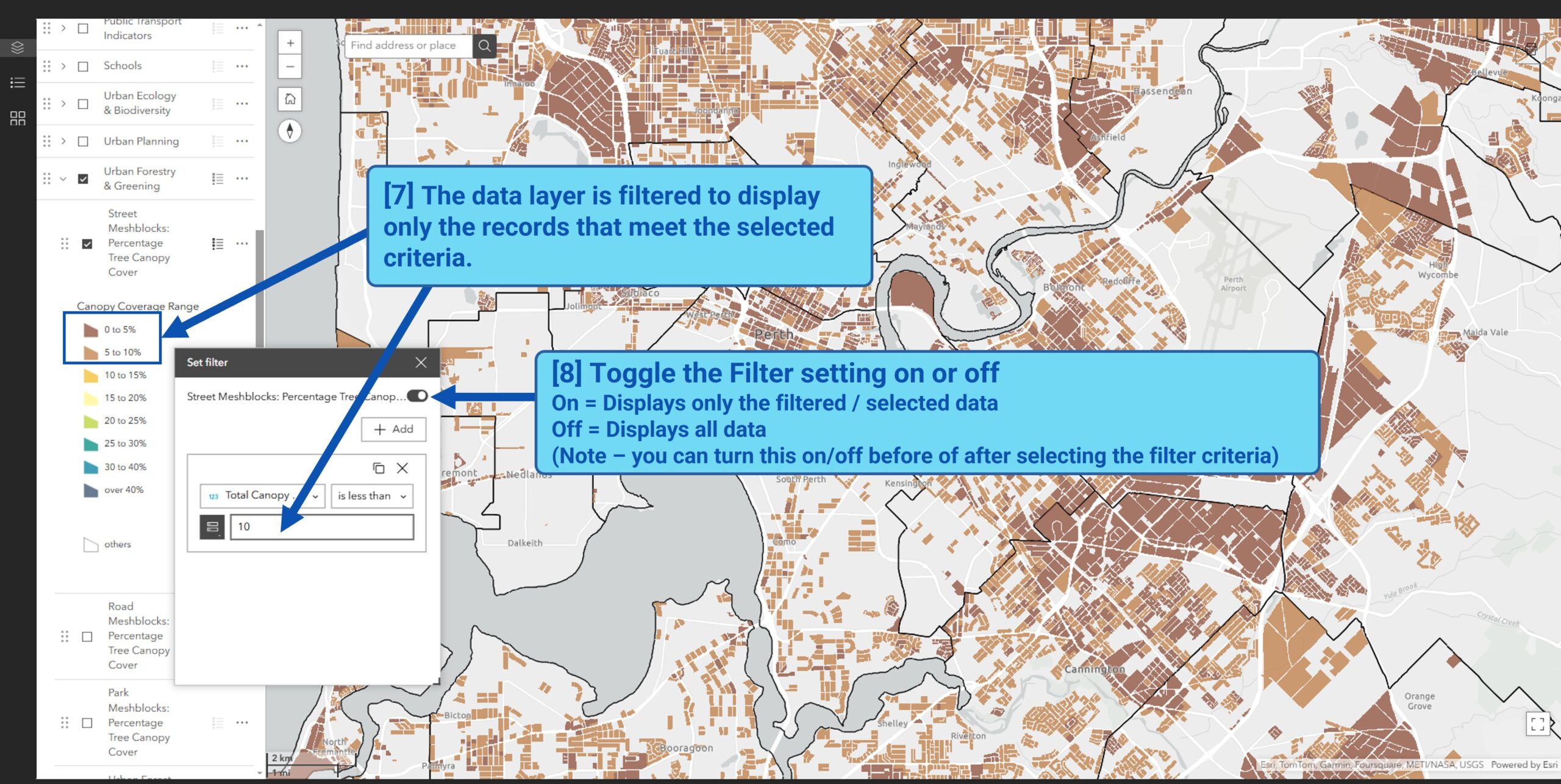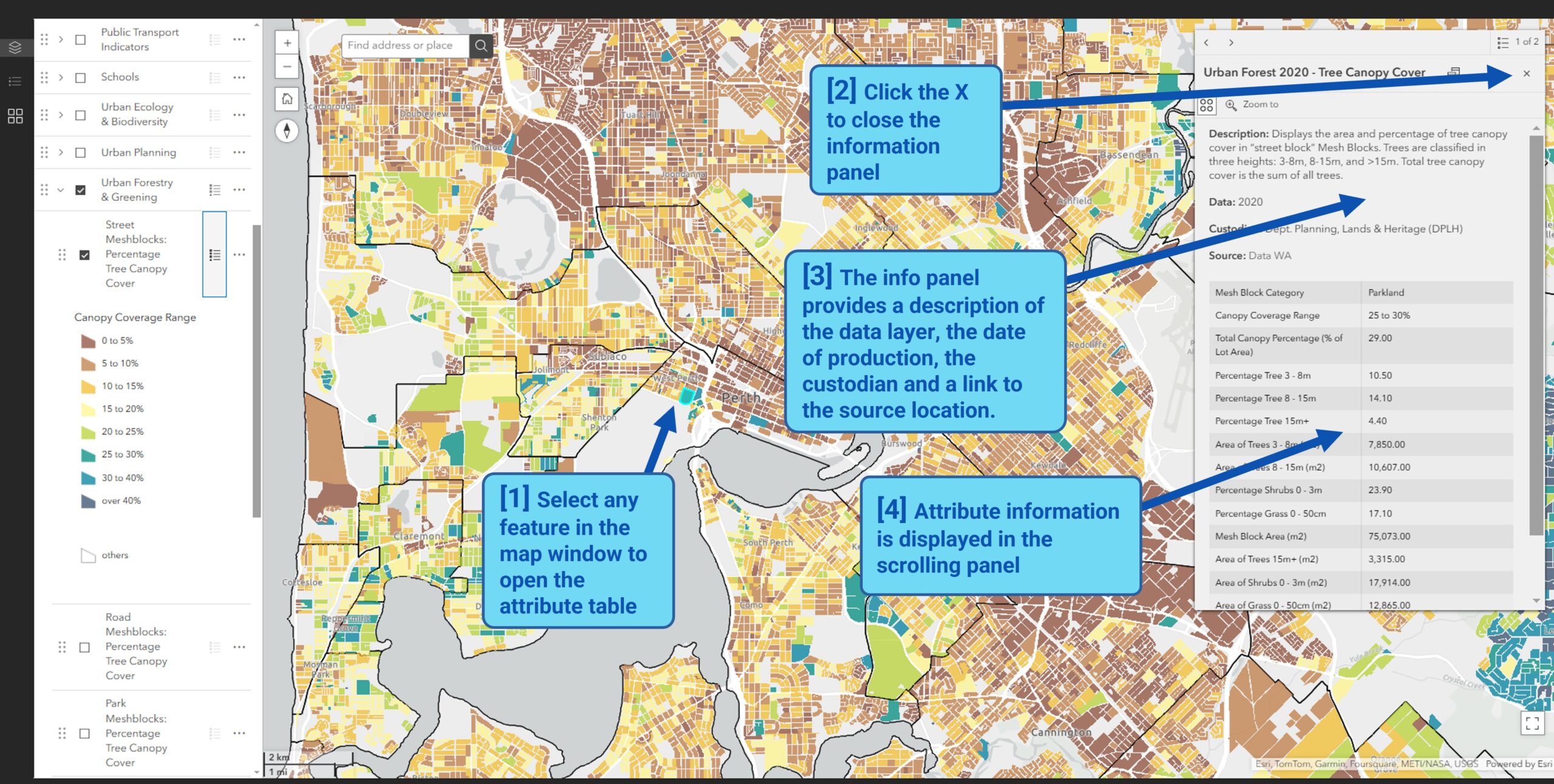 For example, comparing tree canopy cover across different urban forest data collection years, or to examine the relationship between land surface temperature and canopy cover within school catchment areas.