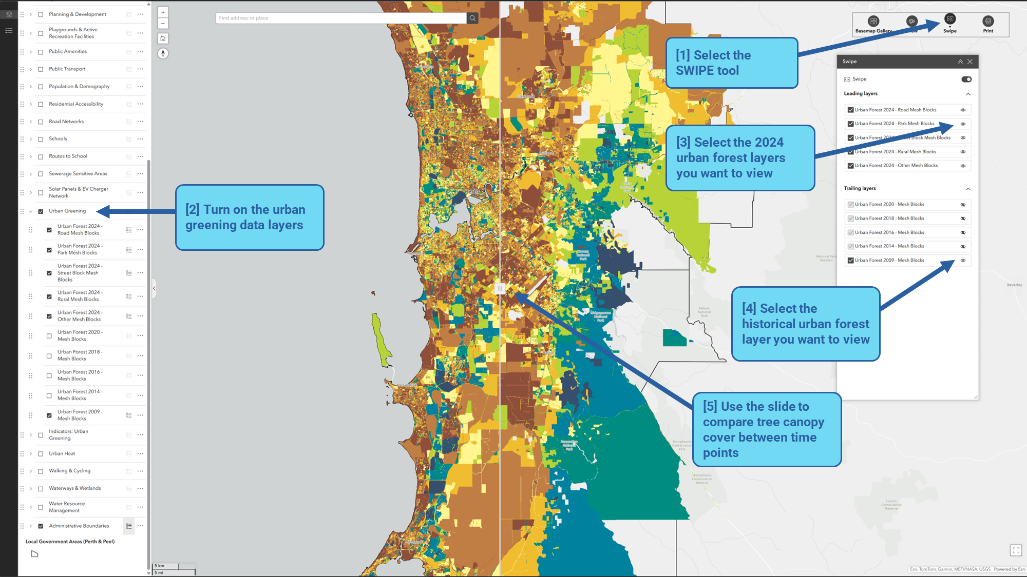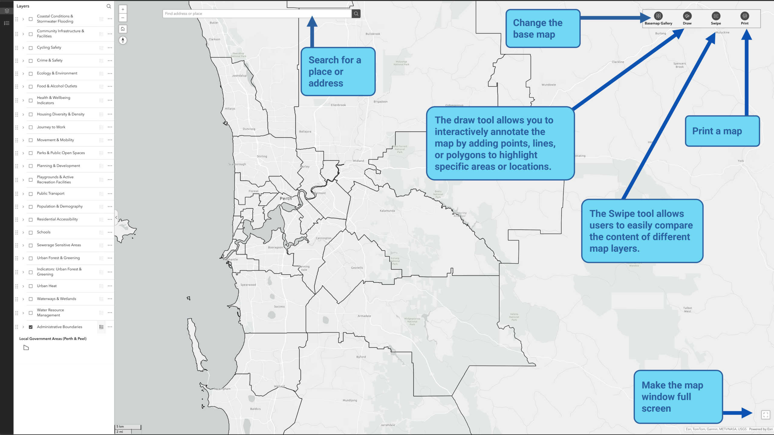 The Swipe tool allows users to easily compare the content of different map layers.